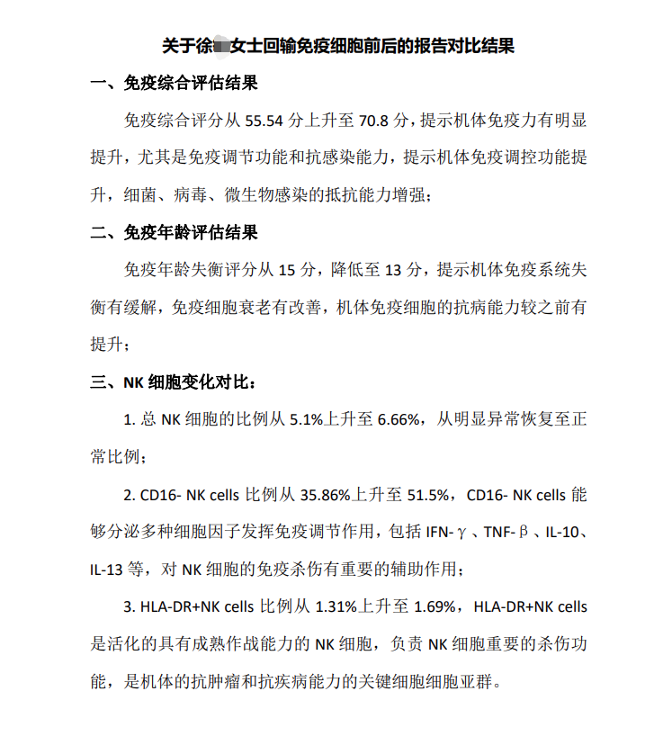 7、总胆固醇高;在初步的体检评估分数表中显示,徐女士的免疫健康中高风险项评分均不太理想,基本属于较差的水平,如果没有及时干预,会发展至免疫健康高风险,届时需花费更多的费用和时间、精力,都难以恢复身体的良好状态。经过医生的专业诊断的建议后,徐女士选择了适合自身状况的治疗方式:血液净化和免疫细胞回输。在经过诊疗后的评估表显示,徐女士的免疫健康风险指标已经从中高风险降至了中风险,整体效果上有了一个质的飞跃!在后期健管师进行健康回访时,徐女士也表示,自己的生活状态和身体状况有了很明显的变化,甚至是自己意想不到的效果:其中最明显的就是精神上的变化,以前每天上班都充满烦躁和疲惫无力感,经过治疗后的这一段时间里,精力旺盛得犹如重拾自己刚进入职场时的热血活力,每天起床感觉神清气爽,不仅工作充满了干劲,对生活也充满了激情,和从前的心态有了天翻地覆的变化。她表示,自己也很意外,没想到免疫细胞回输还会从侧面改变自己的心态。此外,徐女士的皮肤也变得光滑白皙了一个度,面色红润有了光泽,毛孔也细腻了。下属说她看起来就像三十岁的姐姐。再加上生活作息和饮食的调理后,夜晚不再难以入睡,睡眠质量有了极大的提高。并且很实际的感受到免疫力也提高了不少,以前雨季或流感季节、一劳累必会感冒发烧,精神不佳,最近经常出差,碰上雨季,身体也没有任何不舒服的表现。徐女士感慨,这是她做过最值得且效果显著的治疗,还会再选择定期去会输免疫细胞。工作再拼,钱赚再多,身体垮了,也是无济于事。好钢还需用在刀刃上,努力工作赚钱的最终目标还是需要打造一个健康的体魄,去过更好的生活。免疫细胞回输效果因人而异,具体来说,自体免疫细胞回输可以通过以下方式发挥作用:1.抑制自身免疫系统的异常反应,减少炎症反应和组织损伤。2.重建自身免疫系统,增加正常的免疫细胞数量,提高免疫功能。3.某些免疫细胞能够特异性地识别抗原,因此它们的靶向性更强,只对病原体和肿瘤细胞具有杀伤作用,并且能够清除机体内的有害物质。总体来说,回输免疫细胞可以有效减少衰老、损伤细胞带给我们身体的伤害,还可以提升身体免疫力,预防癌症,从而改善身体机能,提高我们的生活质量,让我们对亚健康状态说“不”。1962年免疫学专家Walford提出,随着年龄的增长,免疫器官老化、免疫细胞数量降低,脑、心、肺、肾和肝等重要器官的生理功能下降,将导致人体逐渐出现身体上的不适,增加疾病的发病率。研究数据显示,人体免疫系统的免疫力在20岁左右达到高峰,到了40岁时,就只剩20岁的一半,免疫器官伴随人体开始衰老,尤其是胸腺等器官严重萎缩,免疫能力随着人体衰老,发生免疫衰老。到了70岁,又只有20岁时的1/10,随着免疫力下降,从而就给了癌细胞可乘之机。通过体外活化扩增自体免疫细胞,可以增强免疫系统的功能,进而发挥抗击病原体和肿瘤细胞、促进组织器官再生和机体康复的作用,从而减轻疾病症状、控制疾病进程甚至实现治愈的效果。